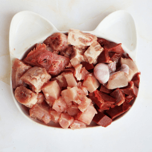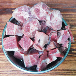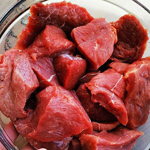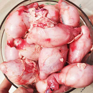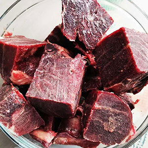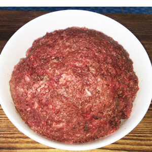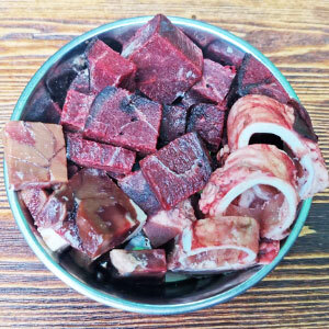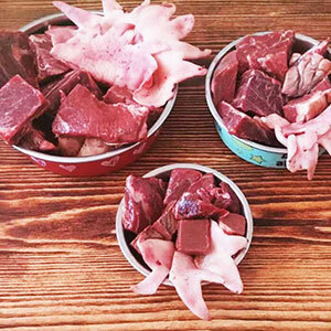 40% говядина 1 сорт, 20% сердце свиное, 20% рубец говяжий, 5% семенники бычьи, 15% шеи куриные