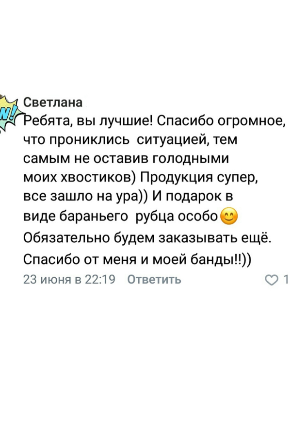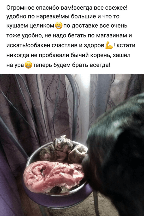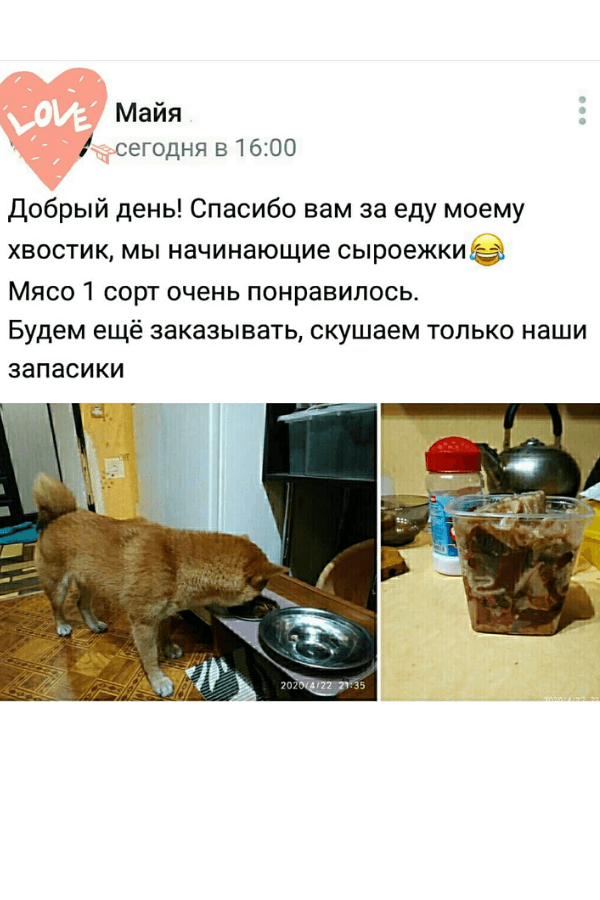 У нас в ассортименте говядина, конина, баранина, мясо птицы, субпродукты и лакомства для песиков. Вы сможете составить полноценный, сбалансированный и при этом разнообразный рацион, от которого будет в восторге даже привереда. И все купить в одном месте!
