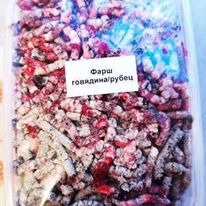 Состав: рубец говяжий, 25% морковь,кабачок, свекла,5% лососевое масло.